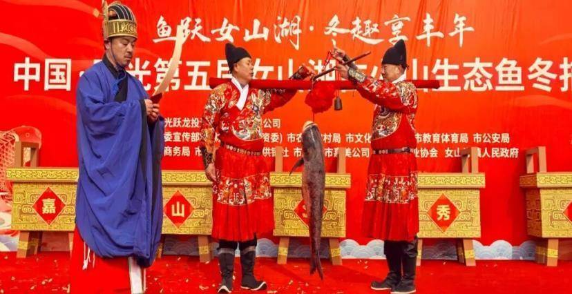 《鱼跃马腾》暖场舞率先登场,以灵动的舞步拉开了冬捕节的帷幕。随后“敬湖仪式”循古举行,礼官奉谷鸣炮,渔工感恩湖泽、祈愿丰稔。仪式落幕,舞狮击鼓,第一网生态鲜鱼起水,银鳞翻腾,满是丰收喜悦。女山湖为安徽第二大淡水湖,古火山口水系矿物质丰富、自净能力强,明光市推行“人放天养、清水养鱼”,养出肉质紧实无土腥的古火山生态鱼,千年敬湖仪式也成为渔民感恩自然、守护生态的写照。