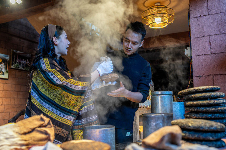 2024年4月13日,一名俄罗斯塔斯社记者(右)在大理市体验包装下关沱茶。据统计,2025年1月至6月,云南省接待入境过夜游客251.03万人次,同比增长86%。