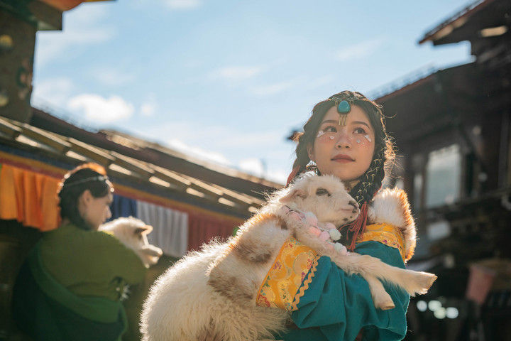 2023年3月8日,游客在迪庆州香格里拉市独克宗古城拍照留念。