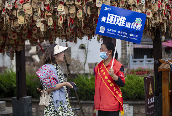 2023年5月18日,一名游客(左)在丽江古城向志愿者咨询。2015年12月,云南丽江古城保护管理局牵头成立了丽江古城旅游志愿者服务队,志愿者主要来自市区机关单位、古城保护管理局、古城经营户、在校学生、社区居民等,常年在古城内提供旅游咨询、道路指引、文明引导等志愿服务。