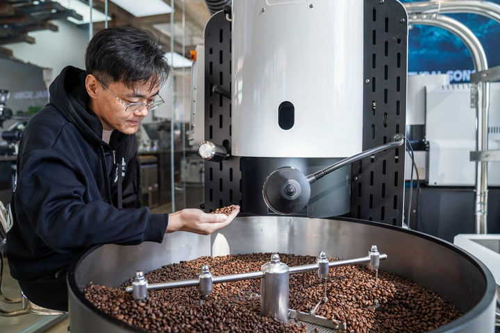 2025年12月10日,韩君玮在位于昆明的南来盛咖啡店内烘焙咖啡豆。